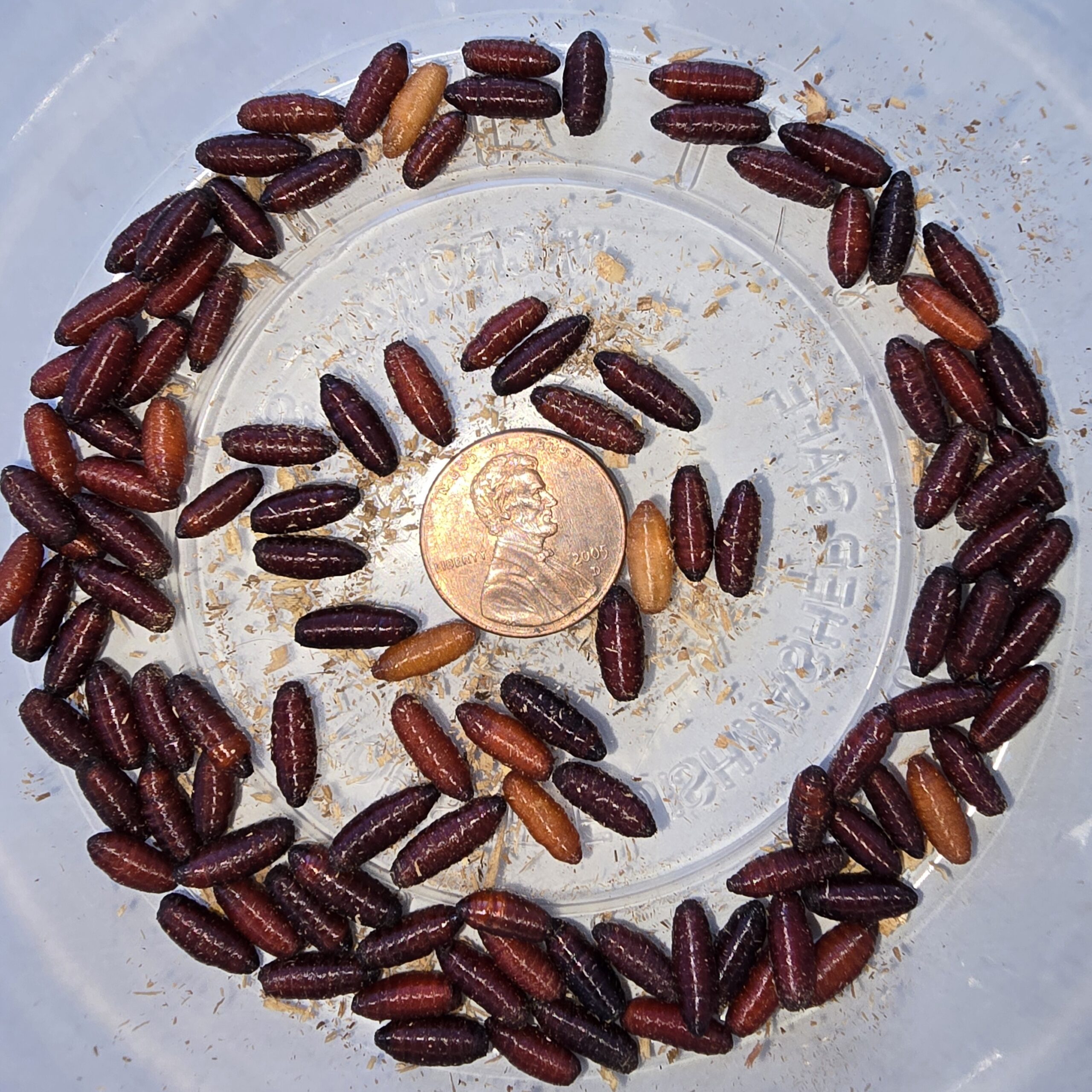 Blue bottle flies are great feeders for many things that may be less interested in crawling foods. They arrive in the convenient life stage (pupae…sort of like cocoons) in the photo above and then hatch out as adult flies usually within about 5 days unless you place them in the refrigerator which will pause their development into adults. In this way you can extend their usefulness for 3 to 6 weeks. They do have a shelf life and leaving them in the fridge too long may cause them to dry up because fridges run fans to evaporate moisture.