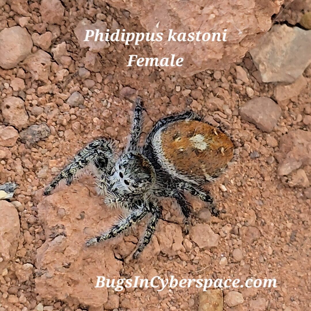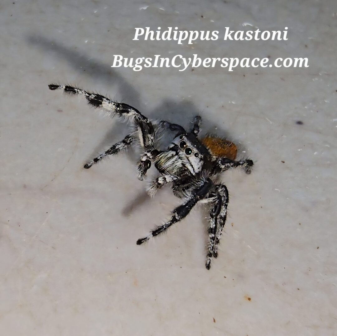 Phidippus kastoni is a California jumping spider species. They remind us a lot of Phidippus tyrrelli and others in the “insignarius group,” but they are in the “mystaceus group.”
