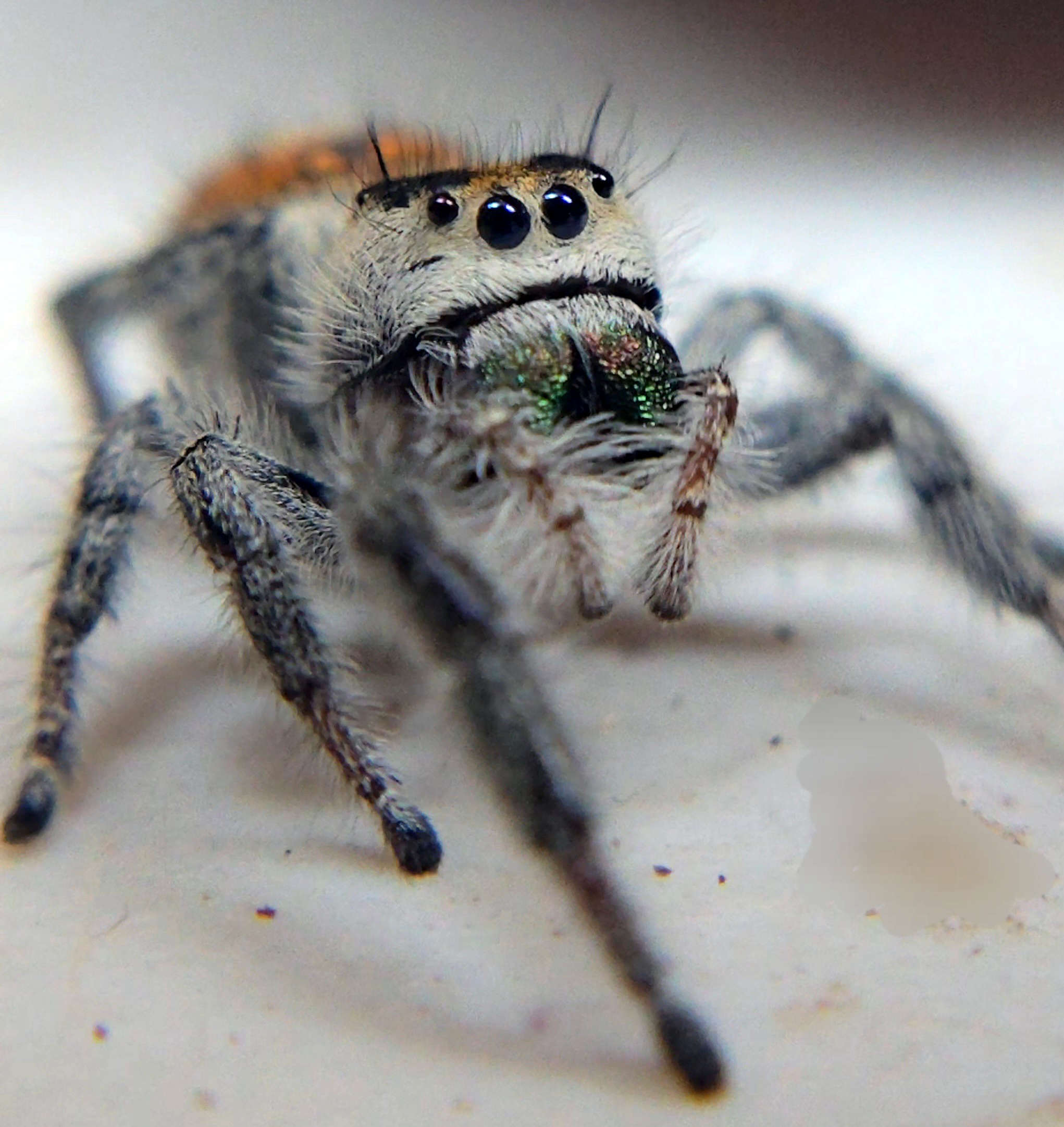 The specimens offered through this listing have a gray and orange and white mother with green chelicerae. It is rare for female Phidippus regius to have green chelicerae. Their father is black and white, with green chelicerae.