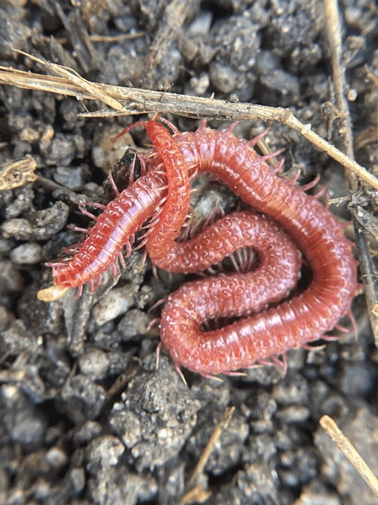 Strigamia is a genus of soil centipedes in the order Geophilomorpha. These centipedes often vivid or bright in their coloration though specific colors are not guaranteed, sorry.